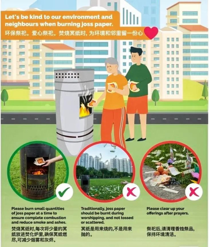 其具体做法包括:在时间上,将祭祀活动主要限定在农历七月(中元节期间),避免分散性影响;在地点上,要求组屋区(社区)内使用市镇理事会提供的专用焚烧桶,减少烟雾和灰烬对环境的污染;在环保措施上,倡导少量焚烧、确保火灰完全燃尽、不抛撒冥纸,并要求祭祀后清理香烛祭品;在约束机制上,对乱扔垃圾、未清理祭祀现场等违规行为,明确了罚款甚至拘留的处罚措施。这种“疏堵结合”的方式,既尊重了民众的祭祀需求,又通过科学管理降低了环境风险。